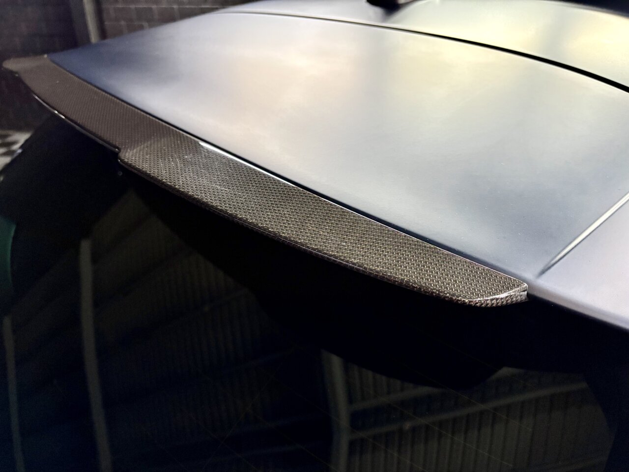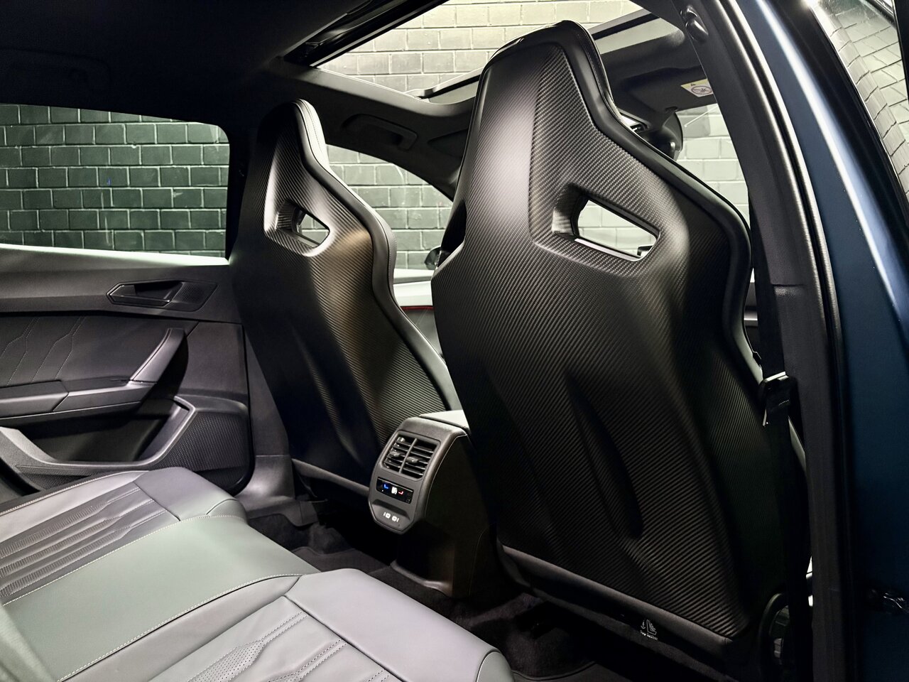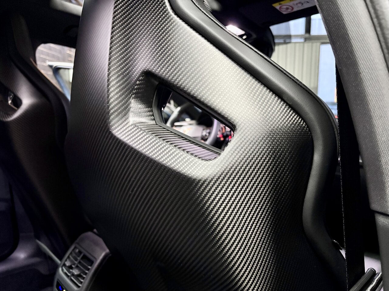 - Spoiler en fibre de carbone en coloris Cuivre, coque des sièges avant en carbone